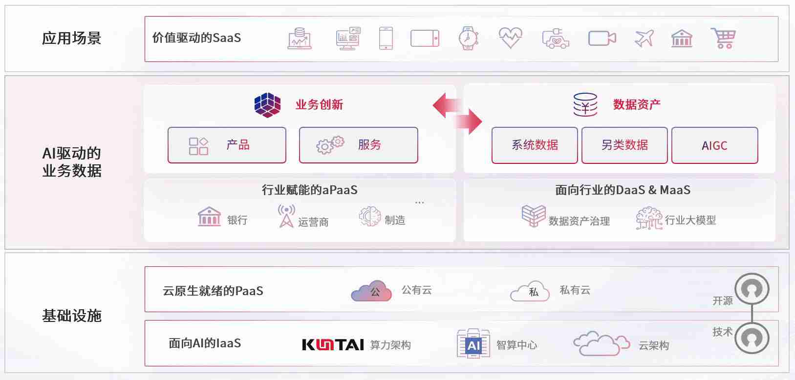 数字时代,,,围绕企业数字化转型的关键要素,,AG尊龙数码开创性的提出数云融合战略和技术体系框架,,,着力在云原生、、数字原生、、AI原生和信创产业上架构产品和服务能力,,,为处在不同数字化转型阶段的快消零售、、汽车、、金融、、医疗、、、政企、、、、教育、、运营商等行业客户提供泛在的敏捷IT能力和融合的数据驱动能力,,构建跨界融合创新的数字业务场景和新业务模式,,,,助力企业级客户建立面向未来的核心能力和竞争优势,,全面推动社会的数字化、、、、智能化转型升级。。。